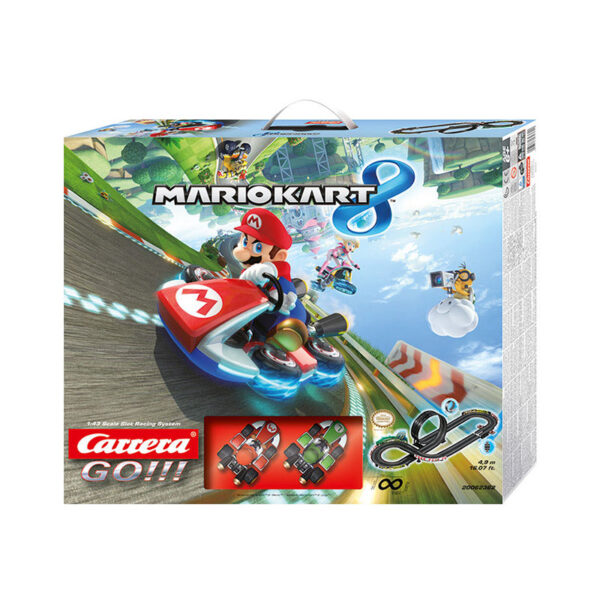 ¿Mario o Luigi? ¿Quién ganará la carrera esta vez? El divertido duelo de los dos hermanos va a la siguiente vuelta. Los fontaneros más famosos del mundo ya se sientan en sus karts y convierten el circuito de Carrera en un sitio inseguro. ¡A toda mecha por la recta de alta velocidad y luego con impulso en la curva! El circuito de 4,9 metros de largo tiene todo lo necesario para una diversión en la carrera durante horas. En el set se incluyen dos coches slot a escala 1:43 y estos entusiasman por su modelado fiel al original.
